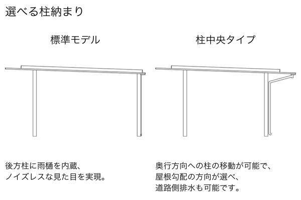 カラー本体:> アルミ色:ブラック、プラチナステン、ピュアシルバー、プラチナステン / 屋根材:部分> アルミ色:ブラック、プラチナステン、ピュアシルバー アルミ色(ブラスト仕上げ):マットシルバー 単色(エンボス調):サンドベージュ、ディープグレイ 木調色:ナチュラルオーク、ドライチーク ※単色(エンボス調)と木調色の色は、屋根材下面のみ。また、柱・梁・四方枠部分の色は、アルミ色「ブラック」のみとなります。