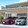 LIXIL「ソルディーポート 3000」は、耐積雪強度100cm相当・耐風圧強度は基準風速Vo=44m/sで、折板屋根と同程度の強度を実現。台風などの強風や積雪など、厳しい自然環境にも対応できるカーポートです。ポリカーボネート屋根は、リビング前に設置しても室内まで日差しを採り込みます。縦に連棟することで車を2台駐車することができます。