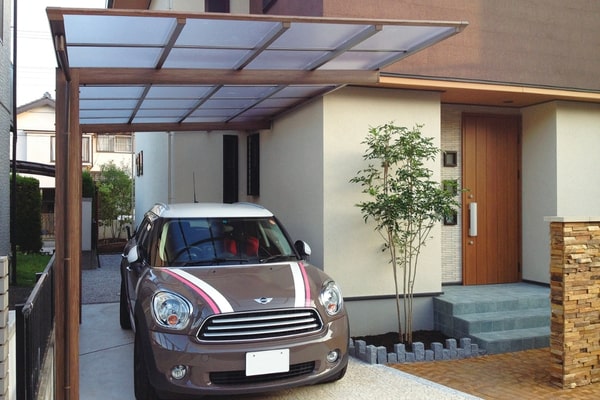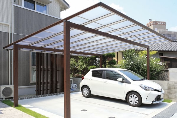 タカショー「アートポート」は、住まいと町並みに調和する、木目の風合いがあたたかい印象を与えるカーポートです。軽自動車と自転車やバイクといった駐車・駐輪の組み合わせも可能です。