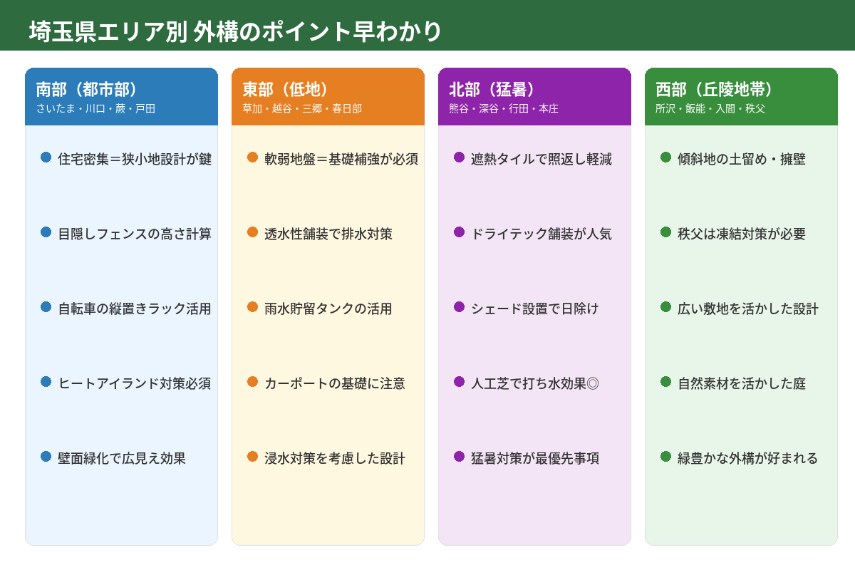 - 埼玉特有の気候・地盤に合わせた外構設計のエリア別ポイント