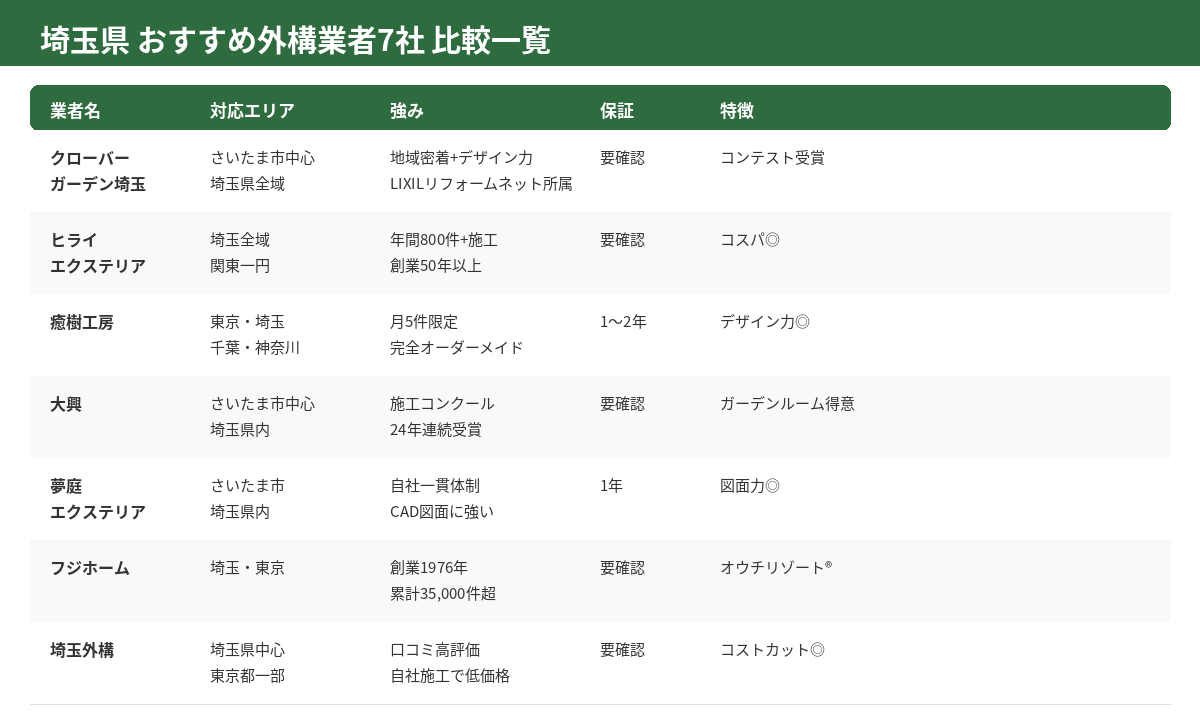 それでは、いよいよ本題です。ここからは、埼玉県で実績・評判ともに信頼できる地元密着の外構業者7社をご紹介します。それぞれの強みや特徴を比較して、あなたにぴったりの業者を見つけてください。