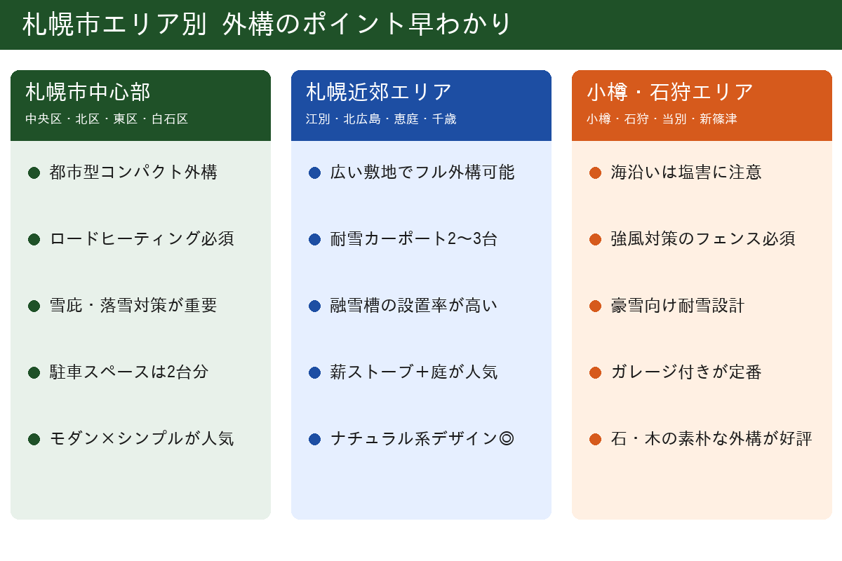 札幌市は広く、エリアによって外構の重点ポイントが変わります。まず、自分の地域の特徴を知ることが大切です。以下では3つのエリアに分けて解説します。