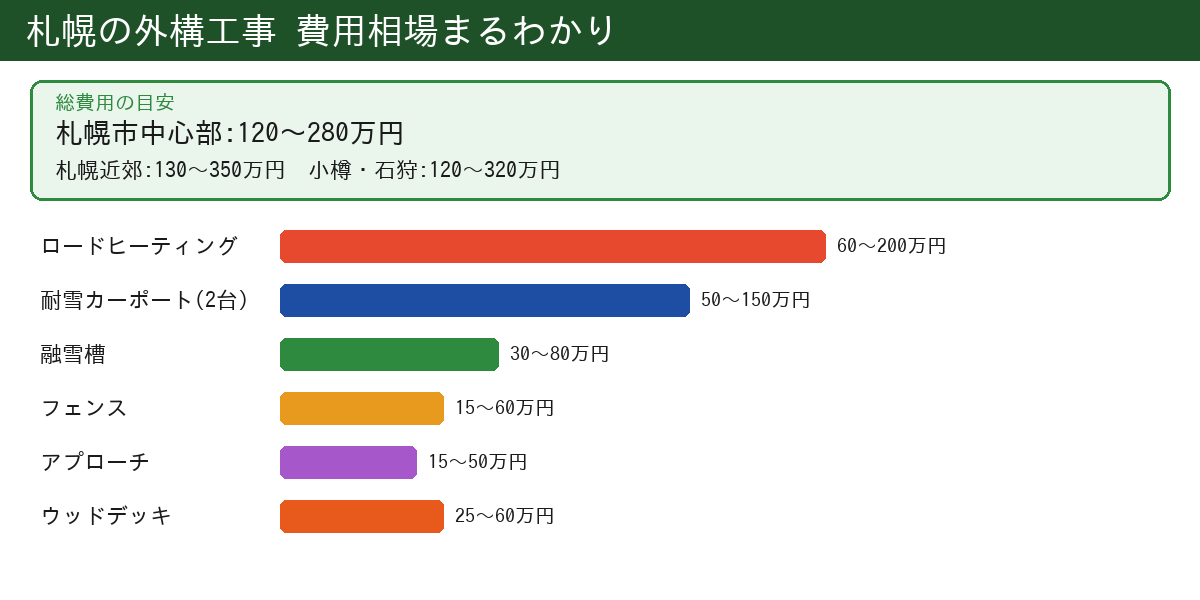 札幌の外構工事は、雪対策設備が加わるため本州よりも費用が高めです。以下に主要工事の相場をまとめました。