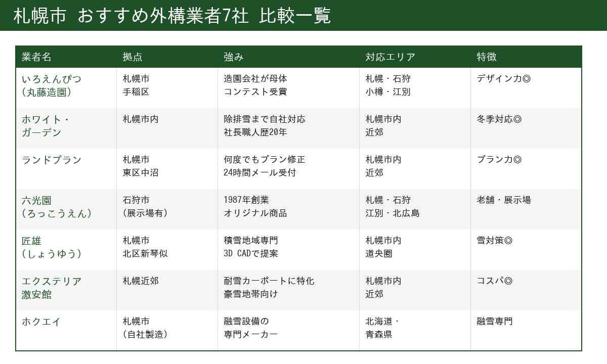 ここからは、札幌市と近郊で評判の良い外構業者を7社紹介します。すべて地元密着で雪国の事情に精通した会社です。